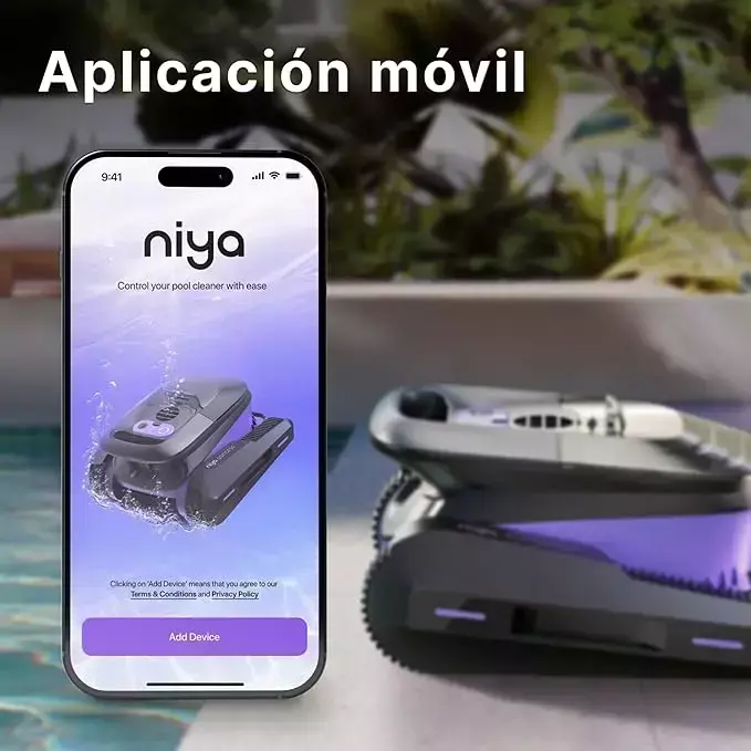 Niya Sonar 50, el limpiafondo inalámbrico diseñado para piscinas de hasta 12 m de largo. Con su potente succión y navegación inteligente, mantiene tu piscina siempre cristalina y lista para disfrutar.